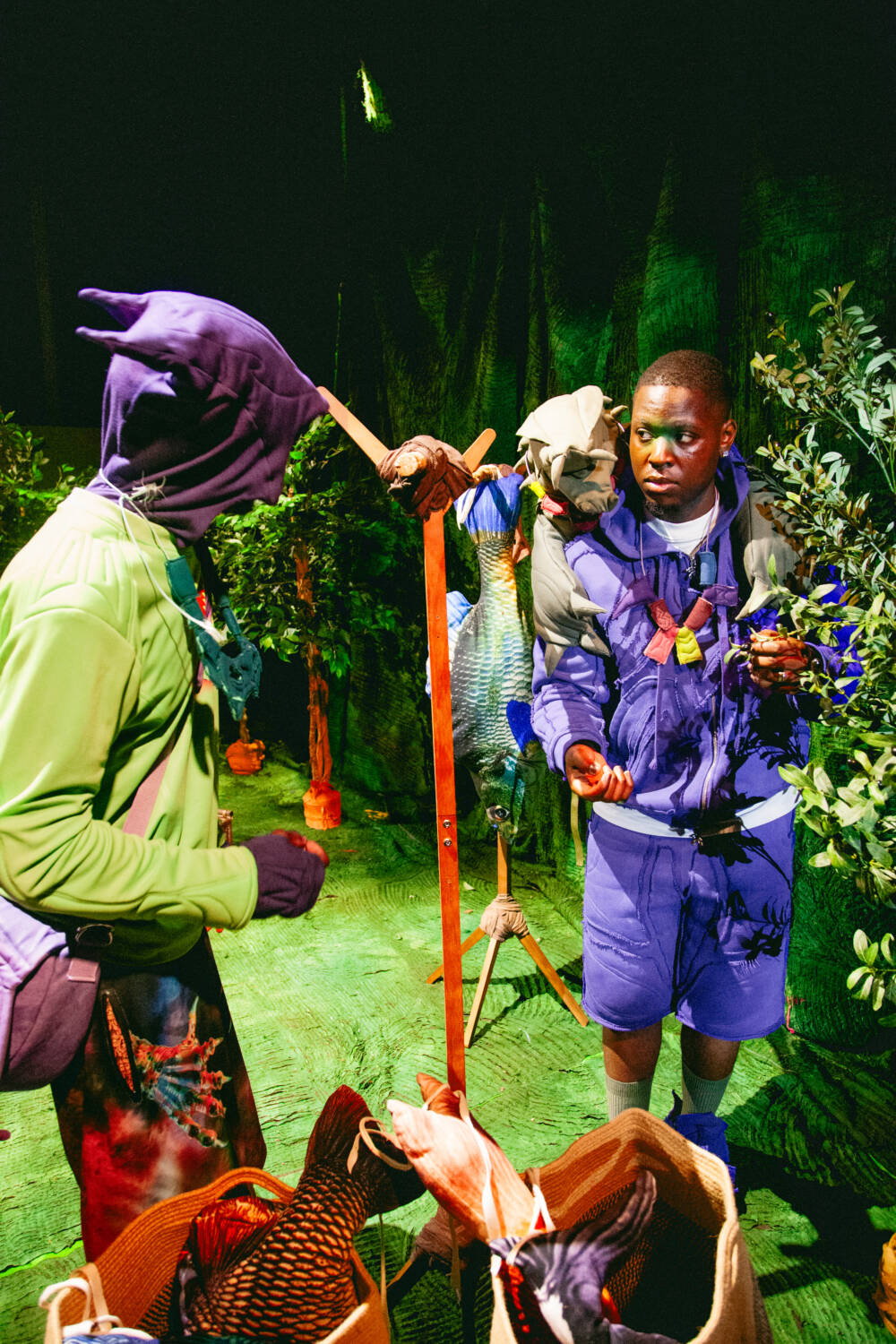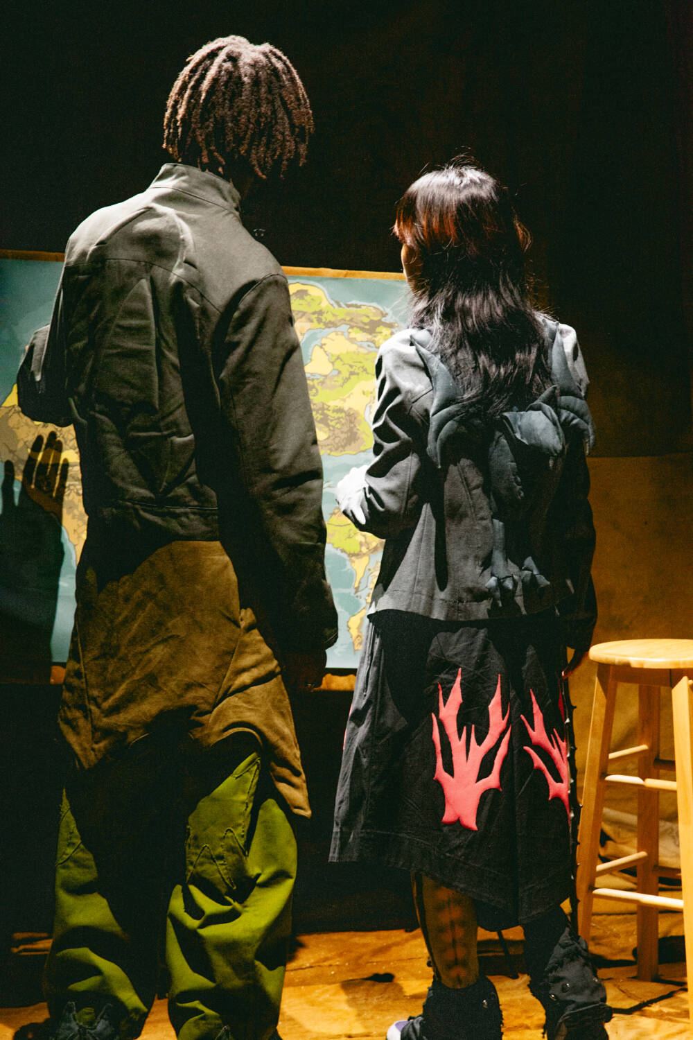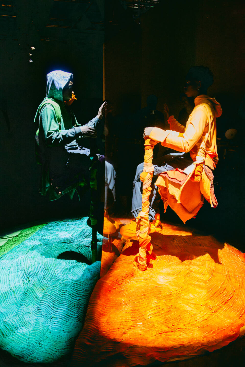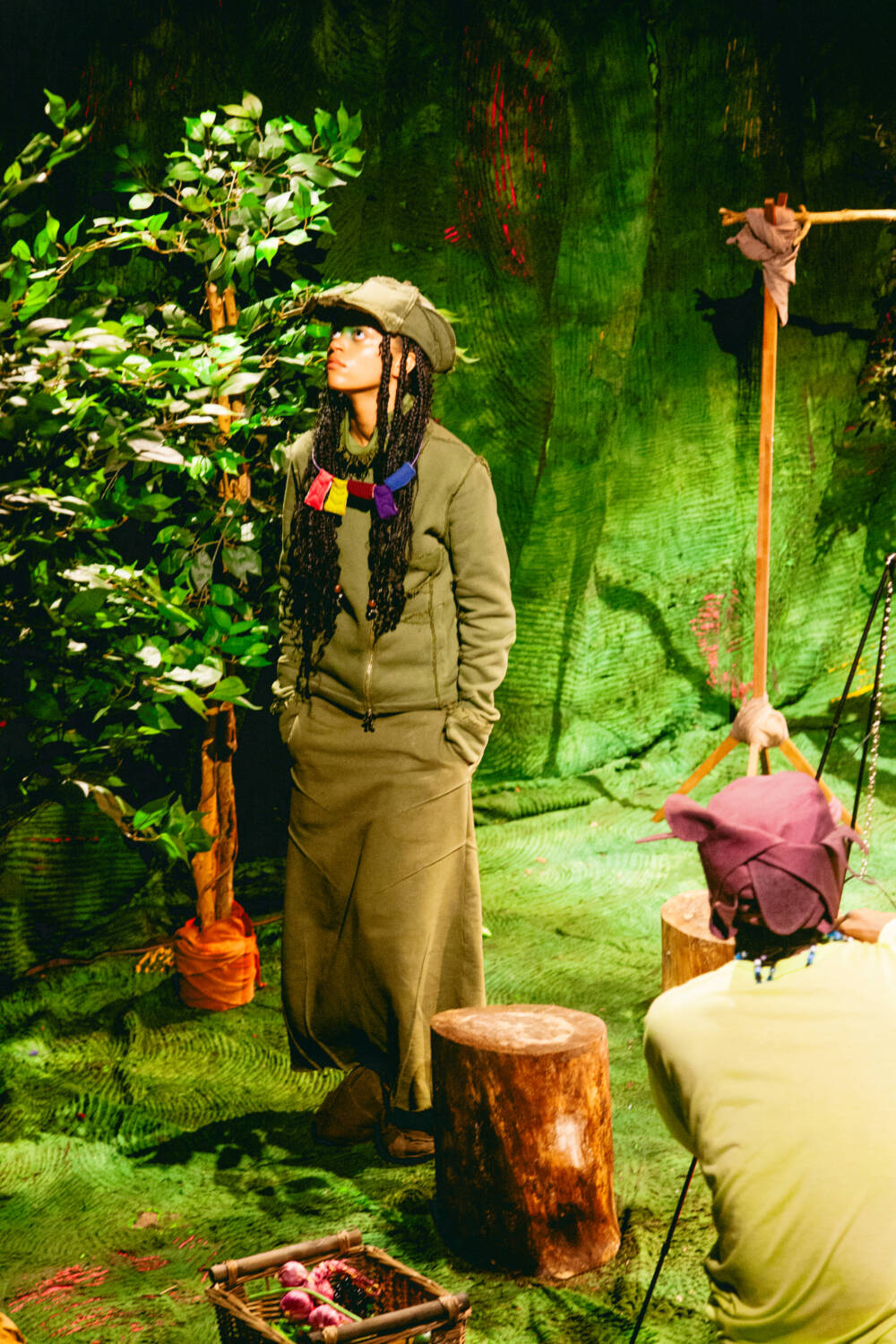 A continuation of ‘The ImPossible Family Reunion in RPG Space’ series, Stapleton’s family were once again reimagined as video game characters in a far-off universe. Set across five areas – including a library and forest – attendees were transported into the Yaku world via scenes that unfolded live in custom-designed sets that utilised leftover materials. Watching as they fished, painted and even battled in one scenario, the presentation allowed for up-close inspection of the clothes in motion.