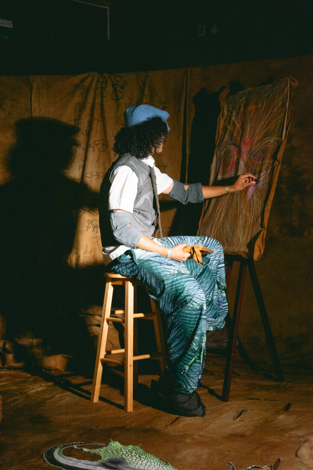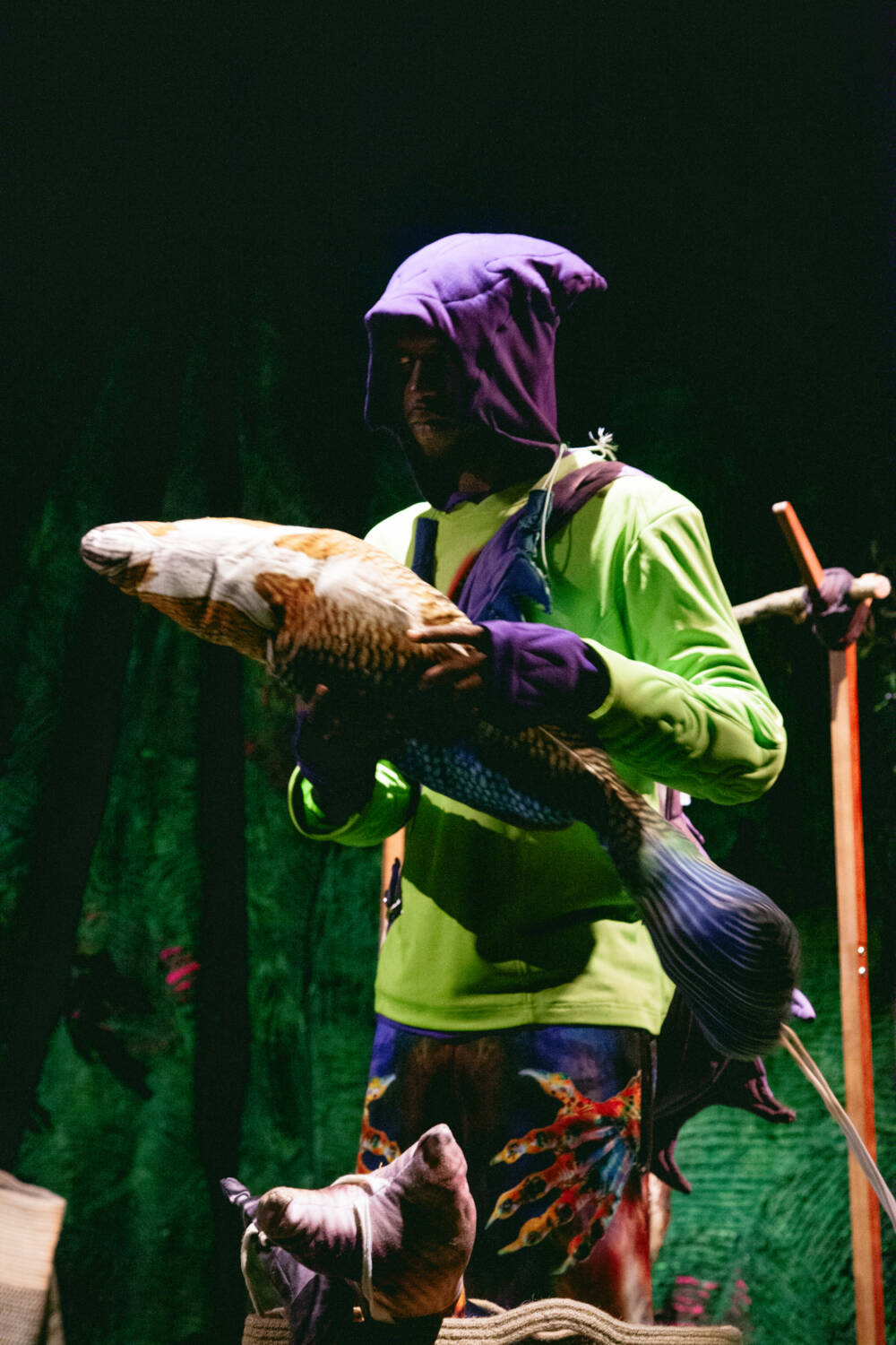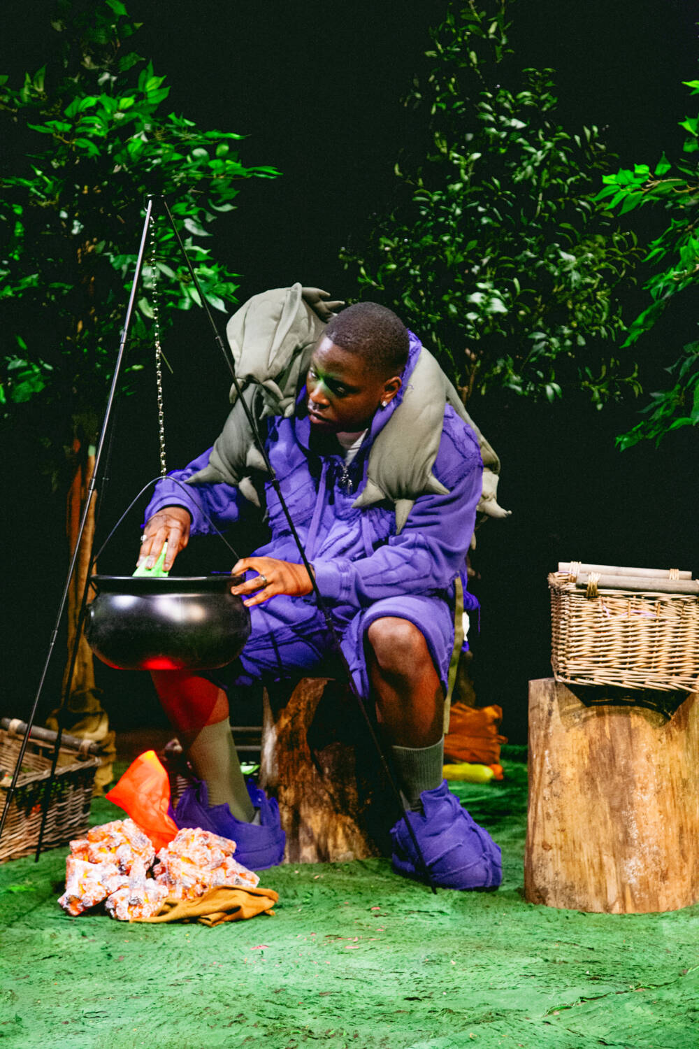 A continuation of ‘The ImPossible Family Reunion in RPG Space’ series, Stapleton’s family were once again reimagined as video game characters in a far-off universe. Set across five areas – including a library and forest – attendees were transported into the Yaku world via scenes that unfolded live in custom-designed sets that utilised leftover materials. Watching as they fished, painted and even battled in one scenario, the presentation allowed for up-close inspection of the clothes in motion.