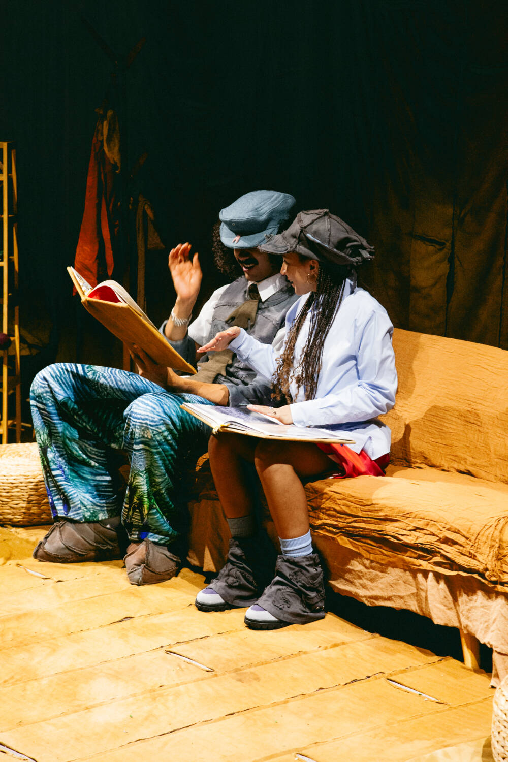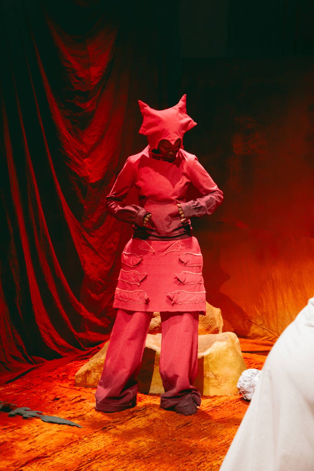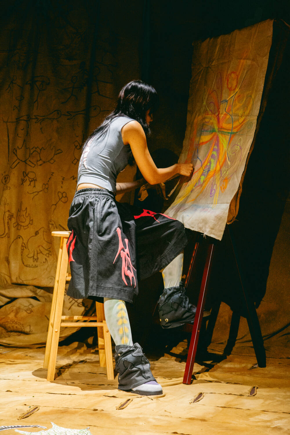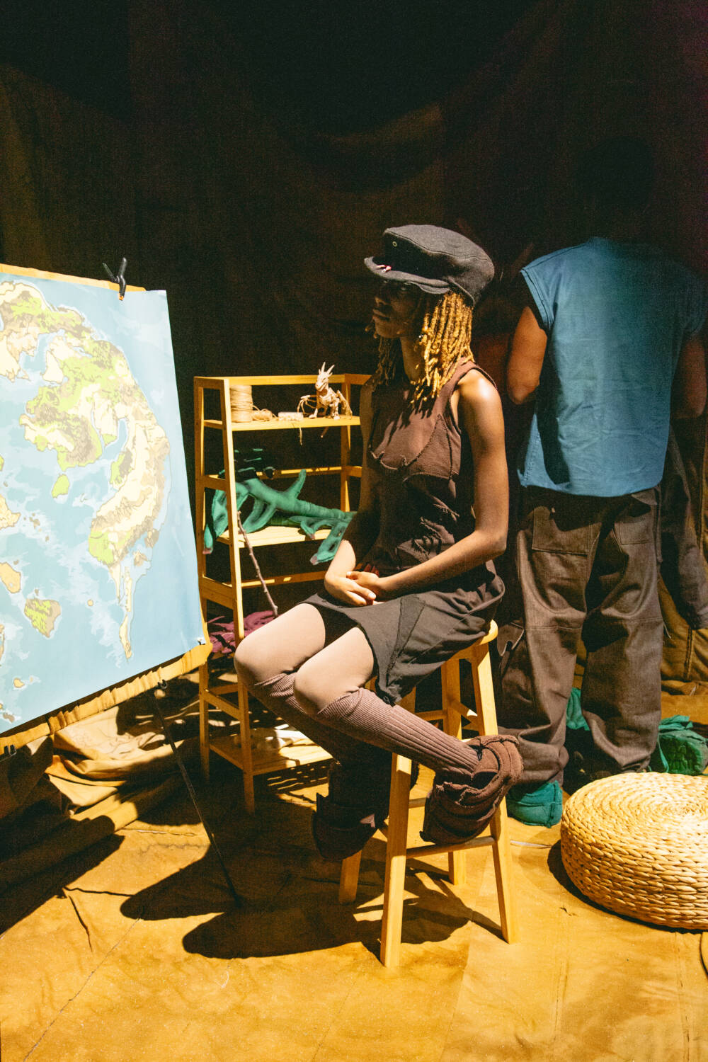 A continuation of ‘The ImPossible Family Reunion in RPG Space’ series, Stapleton’s family were once again reimagined as video game characters in a far-off universe. Set across five areas – including a library and forest – attendees were transported into the Yaku world via scenes that unfolded live in custom-designed sets that utilised leftover materials. Watching as they fished, painted and even battled in one scenario, the presentation allowed for up-close inspection of the clothes in motion.